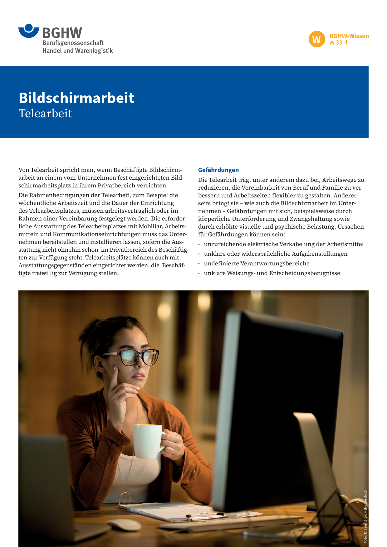 Dieses BGHW-Wissen befasst sich mit den Gefährdungen und Schutzmaßnahmen bei der Telearbeit, also dann, wenn Beschäftigte Bildschirmarbeit an einem vom Unternehmen fest eingerichteten Bildschirmarbeitsplatz in ihrem Privatbereich verrichten. Thematisiert werden dabei u. a. Aspekte wie Arbeitsumgebung, Arbeitsorganisation und soziale Herausforderungen. Enthalten sind zudem Hinweise auf weiterführende Informationen.