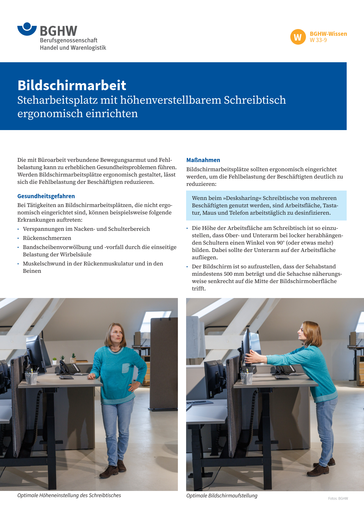 - Bildschirmarbeit – Steharbeitsplatz mit höhenverstellbarem Schreibtisch ergonomisch einrichten (PDF, 2,75 MB)