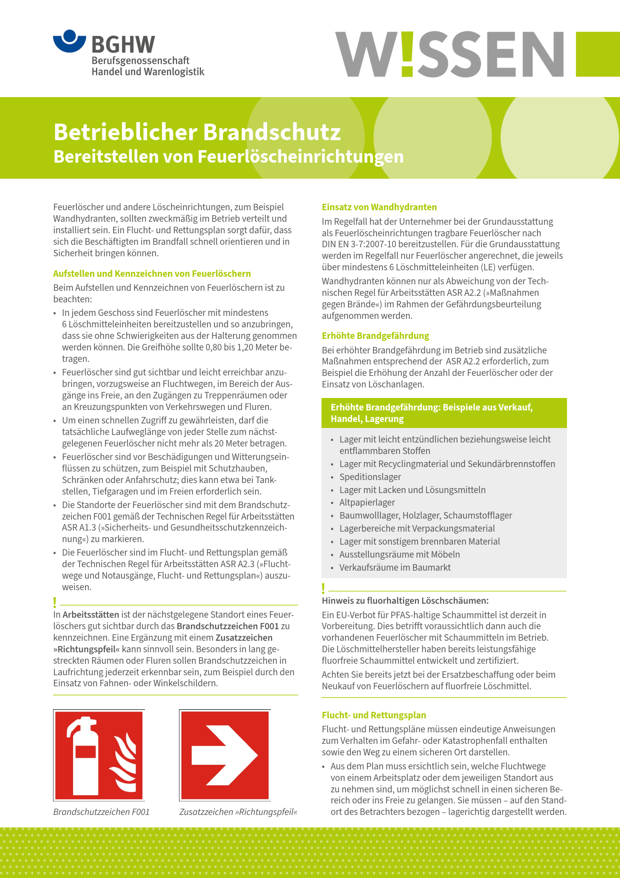 Dieses BGHW-Wissen befasst sich mit dem Aufstellen und Kennzeichnen von Feuerlöschern und dem Einsatz von Wandhydranten. Es nennt Beispiele für eine erhöhte Brandgefährdung im Handel und erläutert die Bedeutung des Flucht- und Rettungsplanes. Enthalten sind zudem Hinweise auf weiterführende Informationen.