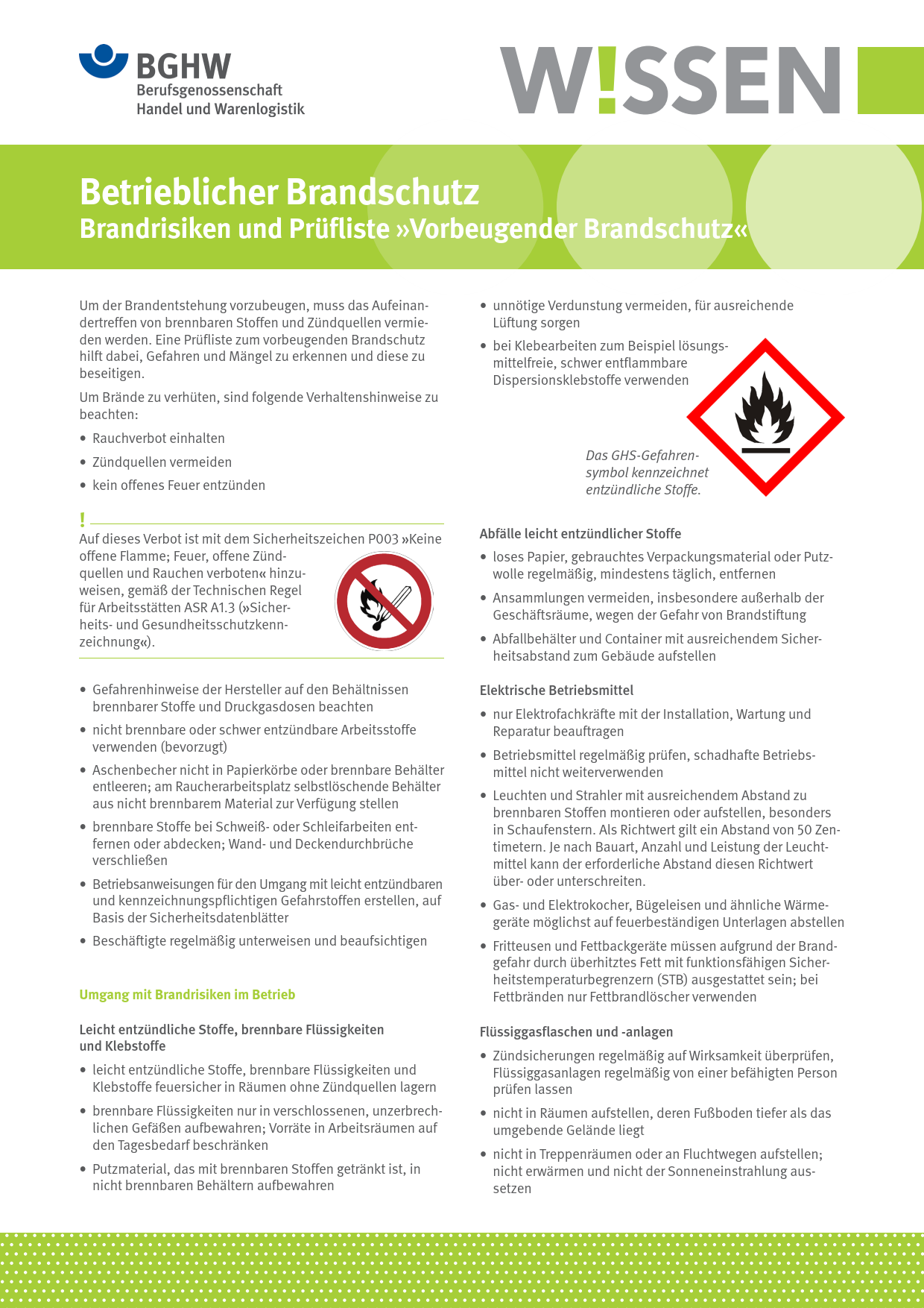 Dieses BGHW-Wissen informiert über die typischen Brandrisiken in Handelsbetrieben sowie geeignete Schutzmaßnahmen. Es enthält eine einfache Prüfliste zur Erkennung von Brandrisiken im eigenen Betrieb sowie Hinweise auf weiterführende Informationen.