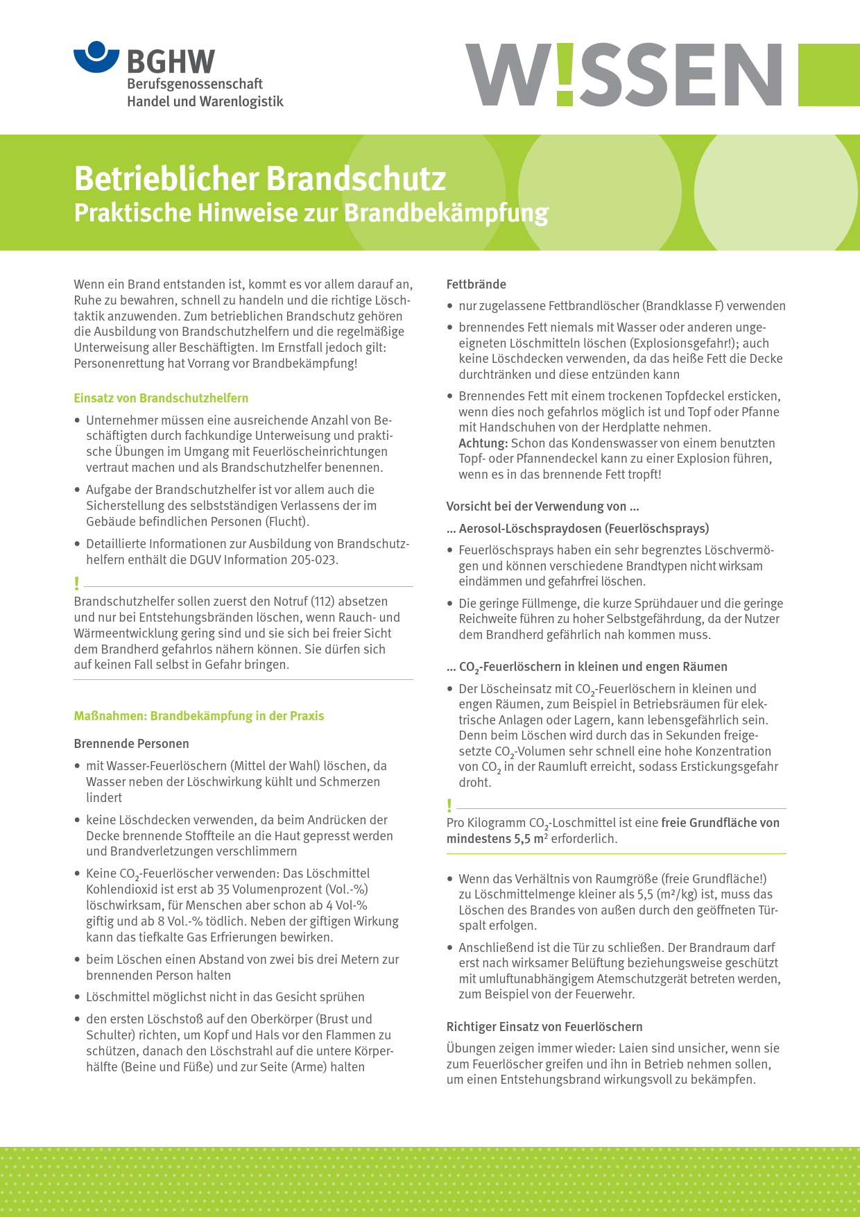 Dieses BGHW-Wissen informiert über das richtige Vorgehen beim Löschen eines Brandes und geht auf die richtige Auswahl der Löschmittel ein. Enthalten sind zudem Hinweise auf weiterführende Informationen.