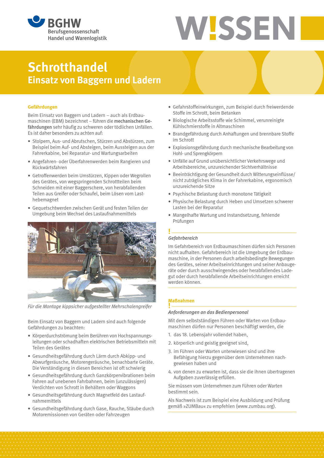 Dieses BGHW-Wissen befasst sich mit den Gefährdungen und Schutzmaßnahmen beim Einsatz von Baggern und Ladern im Schrotthandel. Enthalten sind darüber hinaus Hinweise auf weiterführende Informationen.
