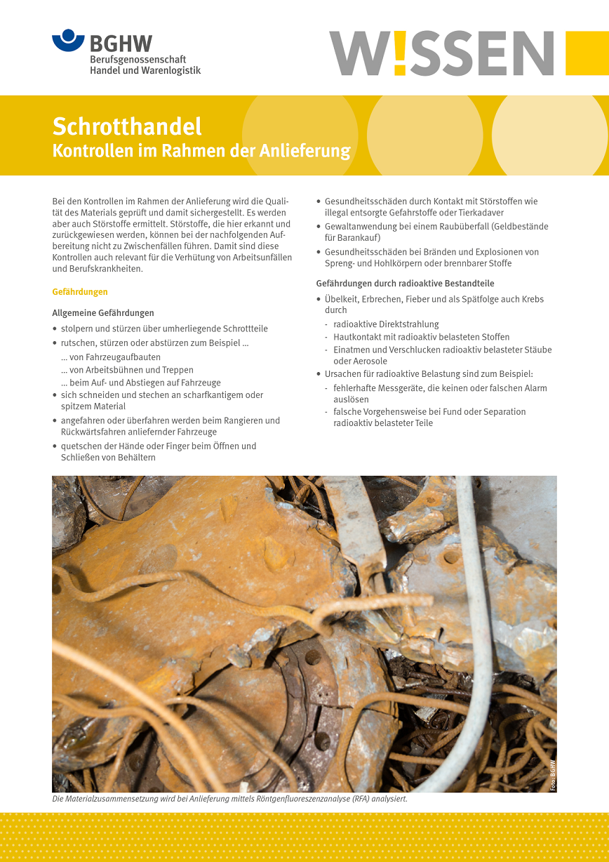 Dieses BGHW-Wissen befasst sich mit der Notwendigkeit von Anlieferungskontrollen im Schrotthandel. Enthalten sind darüber hinaus Hinweise auf weiterführende Informationen.