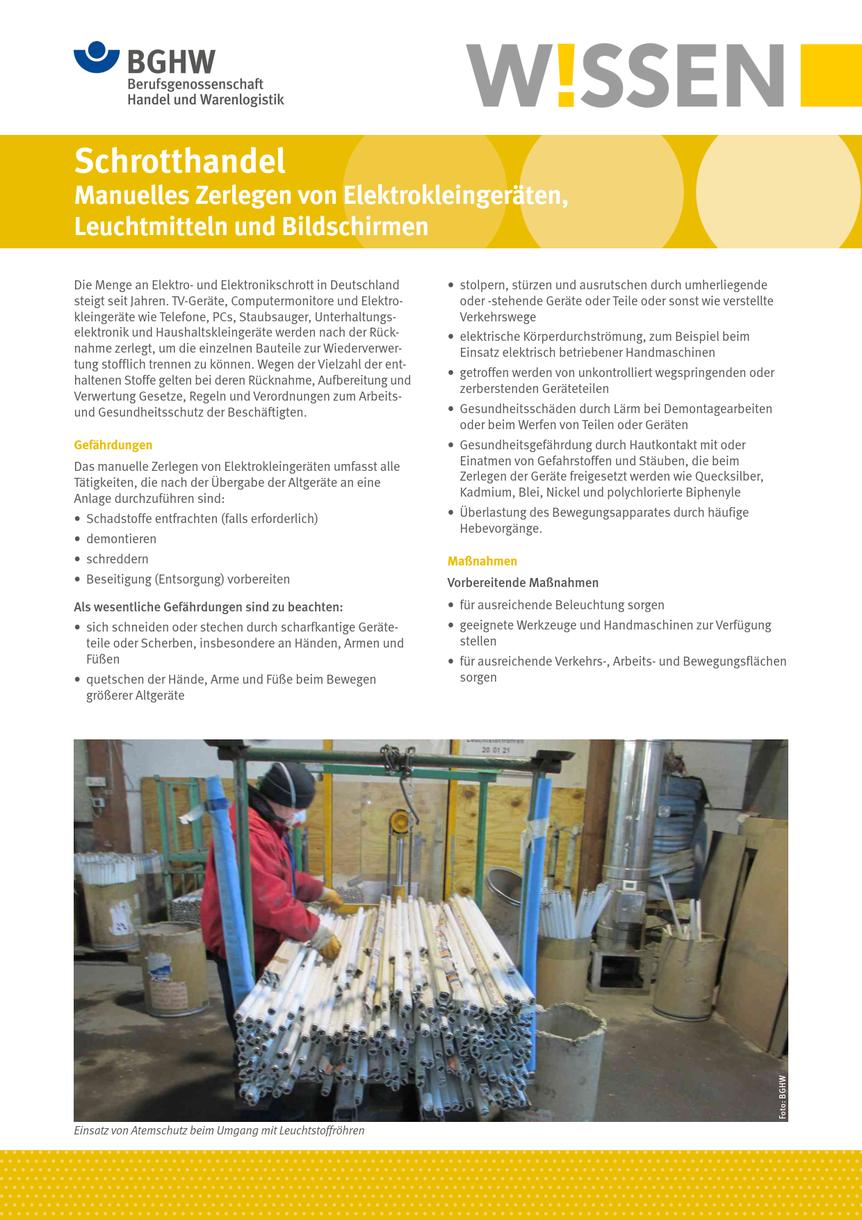 Dieses BGHW-Wissen befasst sich mit den Gefährdungen und Schutzmaßnahmen beim manuellen Zerlegen von Elektroaltgeräten im Schrotthandel. Enthalten sind darüber hinaus Hinweise auf weiterführende Informationen.