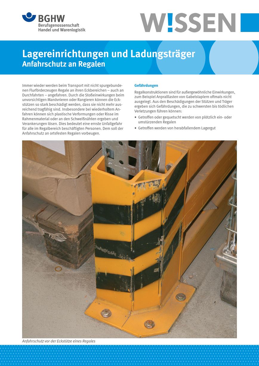 - Lagereinrichtungen und Ladungsträger - Anfahrschutz an Regalen (PDF, 4,59 MB)