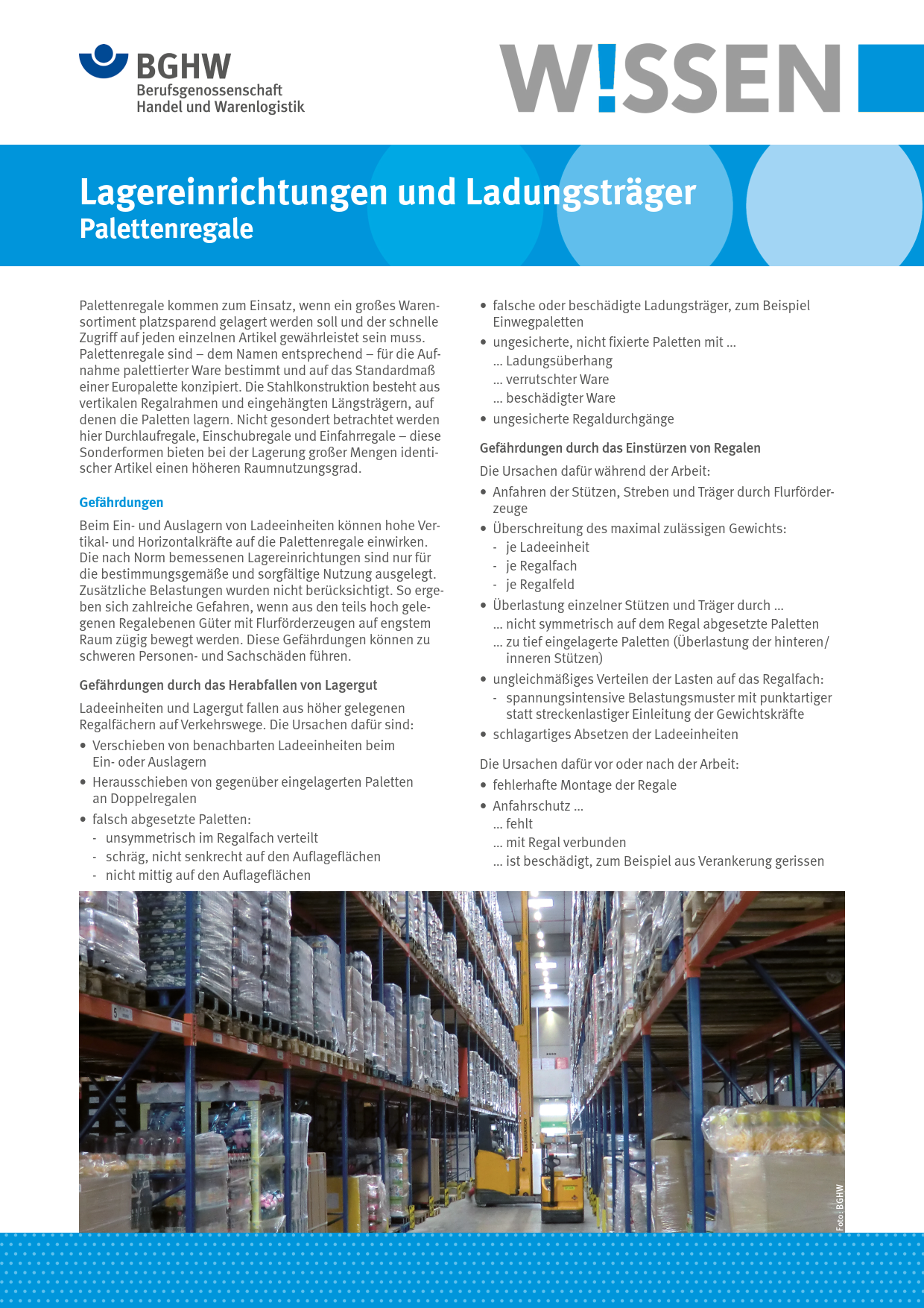 Dieses BGHW-Wissen informiert über Palettenregale, die für die Aufnahme palettierter Ware bestimmt und für das Standardmaß einer Europalette konzipiert sind. Damit verbundene Gefährdungen wie das Herabfallen von Lagergut werden ebenso thematisiert wie sinnvolle Schutzmaßnahmen. Enthalten sind zudem Hinweise auf weiterführende Informationen.