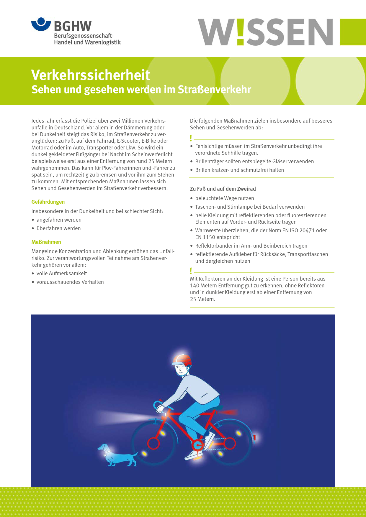 Dieses BGHW-Wissen weist auf die Gefährdungen bei der Teilnahme am Straßenverkehr in der Dämmerung und Dunkelheit hin. Es zeigt sinnvolle Präventionsmaßnahmen auf und enthält zudem Hinweise auf weiterführende Informationen.