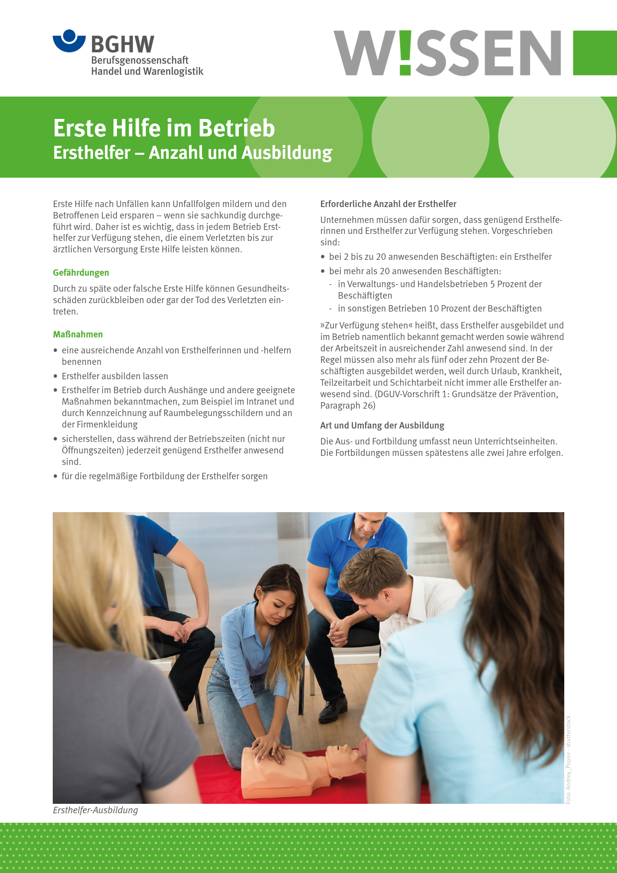Dieses BGHW-Wissen informiert insbesondere über die erforderliche Anzahl von Ersthelfenden im Unternehmen sowie Art, Umfang, Anmeldung und Kosten der Ausbildung. Enthalten sind zudem Hinweise auf weiterführende Informationen.