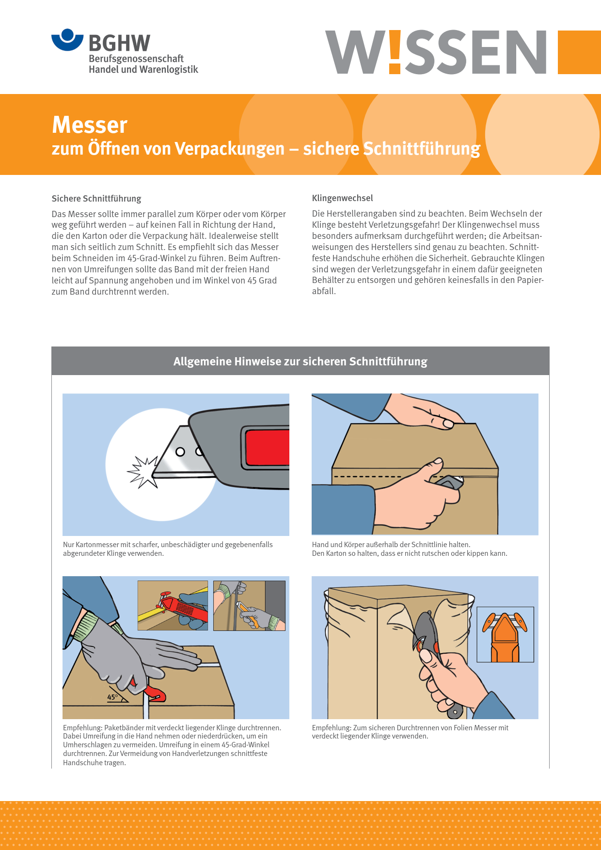 Dieses BGHW-Wissen informiert über die sichere Handhabung von Sicherheitsmessern beim Öffnen von Kartons und Folienverpackungen. Es beschreibt außerdem den sicheren Klingenwechsel. Enthalten sind darüber hinaus Hinweise auf weiterführende Informationen.