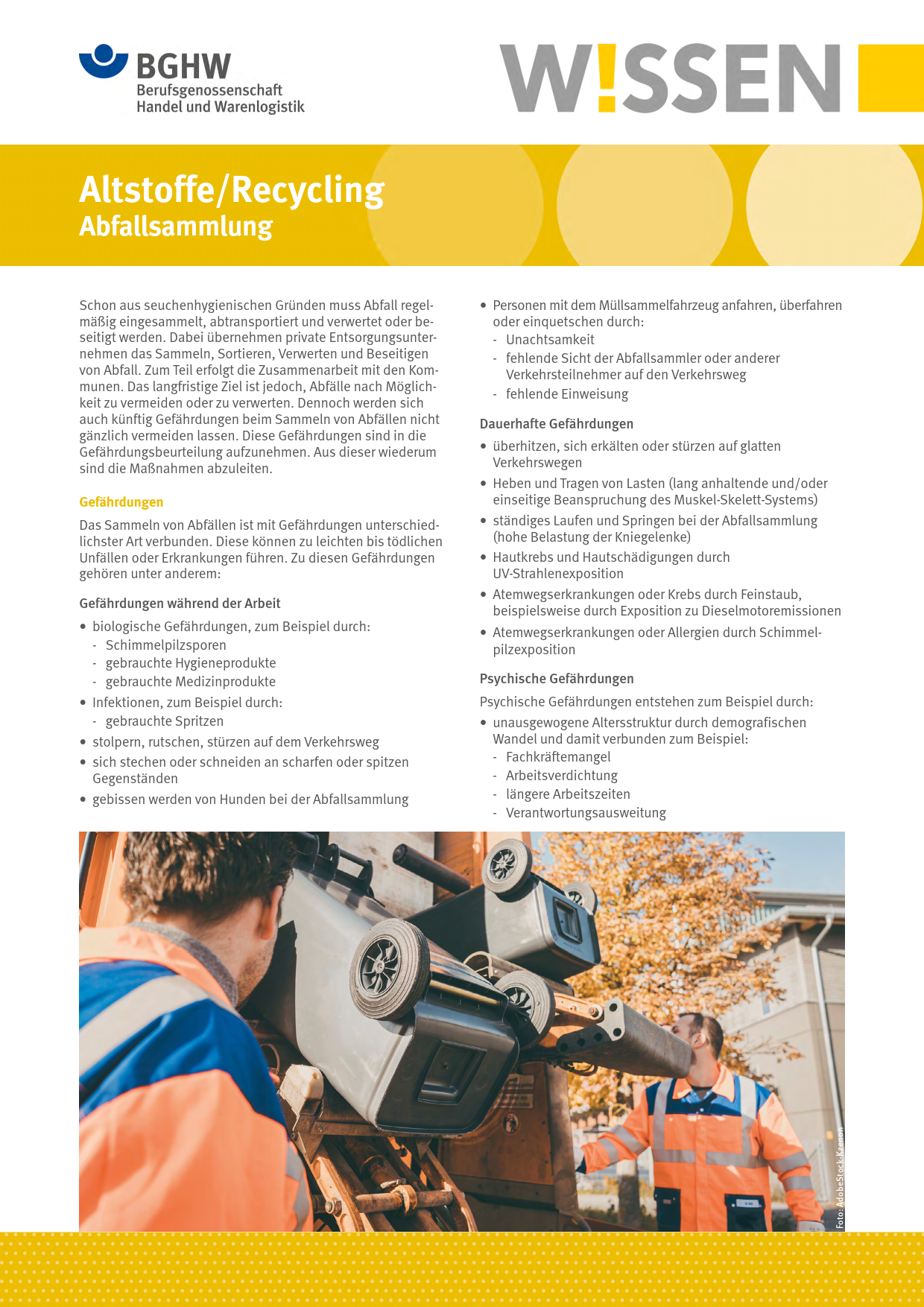 Dieses BGHW-Wissen befasst sich mit Gefährdungen, denen Beschäftigte in Entsorgungsunternehmen bei der Abfallsammlung ausgesetzt sein können. Es enthält umfangreiche Empfehlungen für Schutzmaßnahmen sowie Hinweise auf weiterführende Informationen.