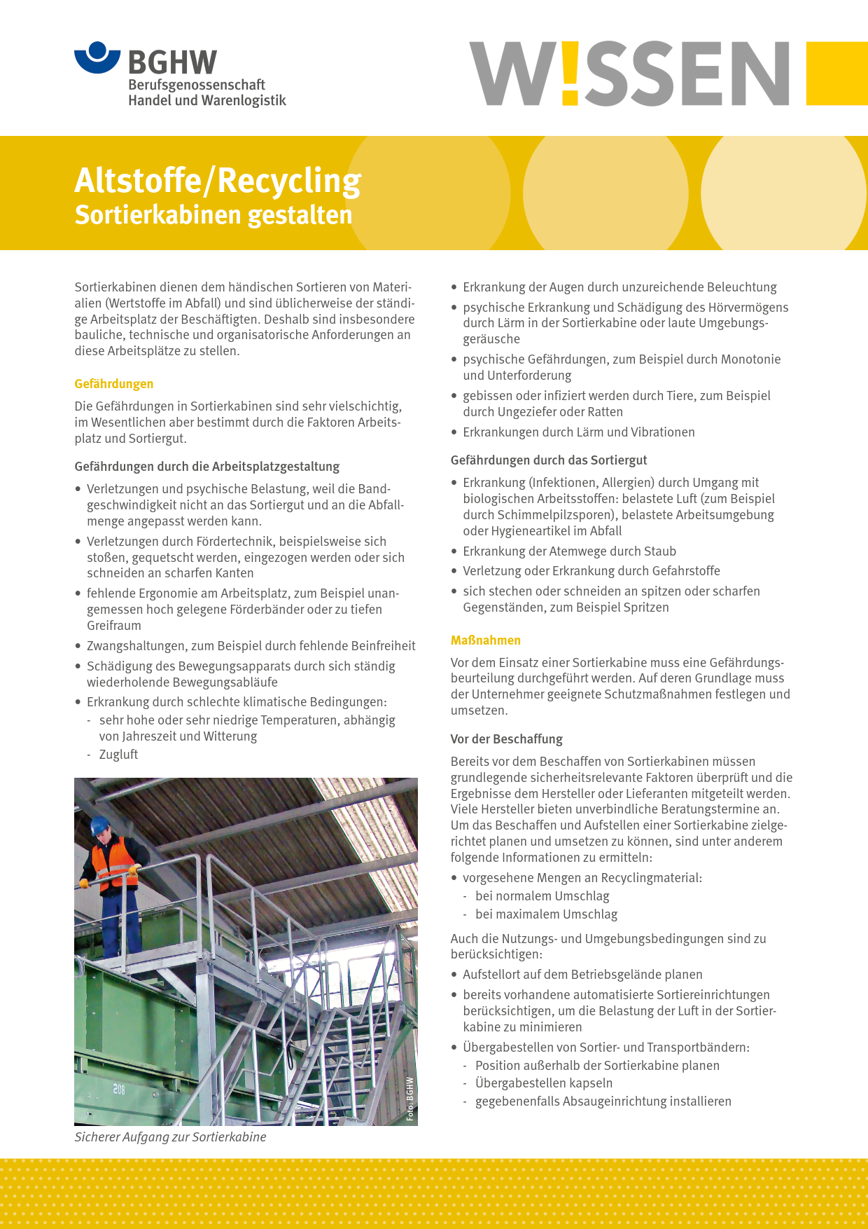 Dieses BGHW-Wissen befasst sich mit Gefährdungen an Arbeitsplätzen in Sortierkabinen, die sich z. B. durch die Arbeitsplatzgestaltung oder das Sortiergut ergeben können. Es enthält auch umfangreiche Empfehlungen für Schutzmaßnahmen sowie Hinweise auf weiterführende Informationen.