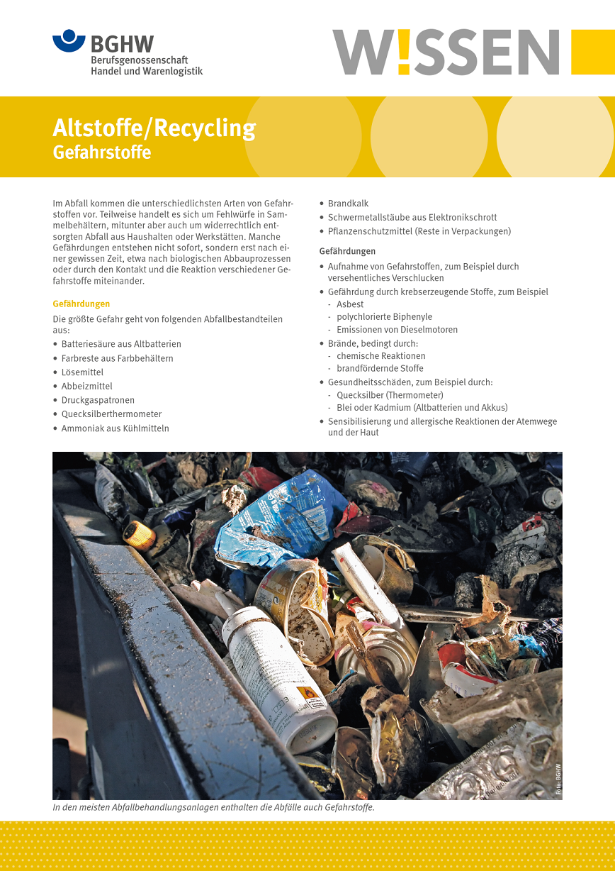 Dieses BGHW-Wissen thematisiert Gefährdungen durch Gefahrstoffe im Abfall, wie z. B. Batteriesäure, Farbreste oder Lösemittel. Es enthält zudem umfangreiche Empfehlungen für Schutzmaßnahmen sowie Hinweise auf weiterführende Informationen.