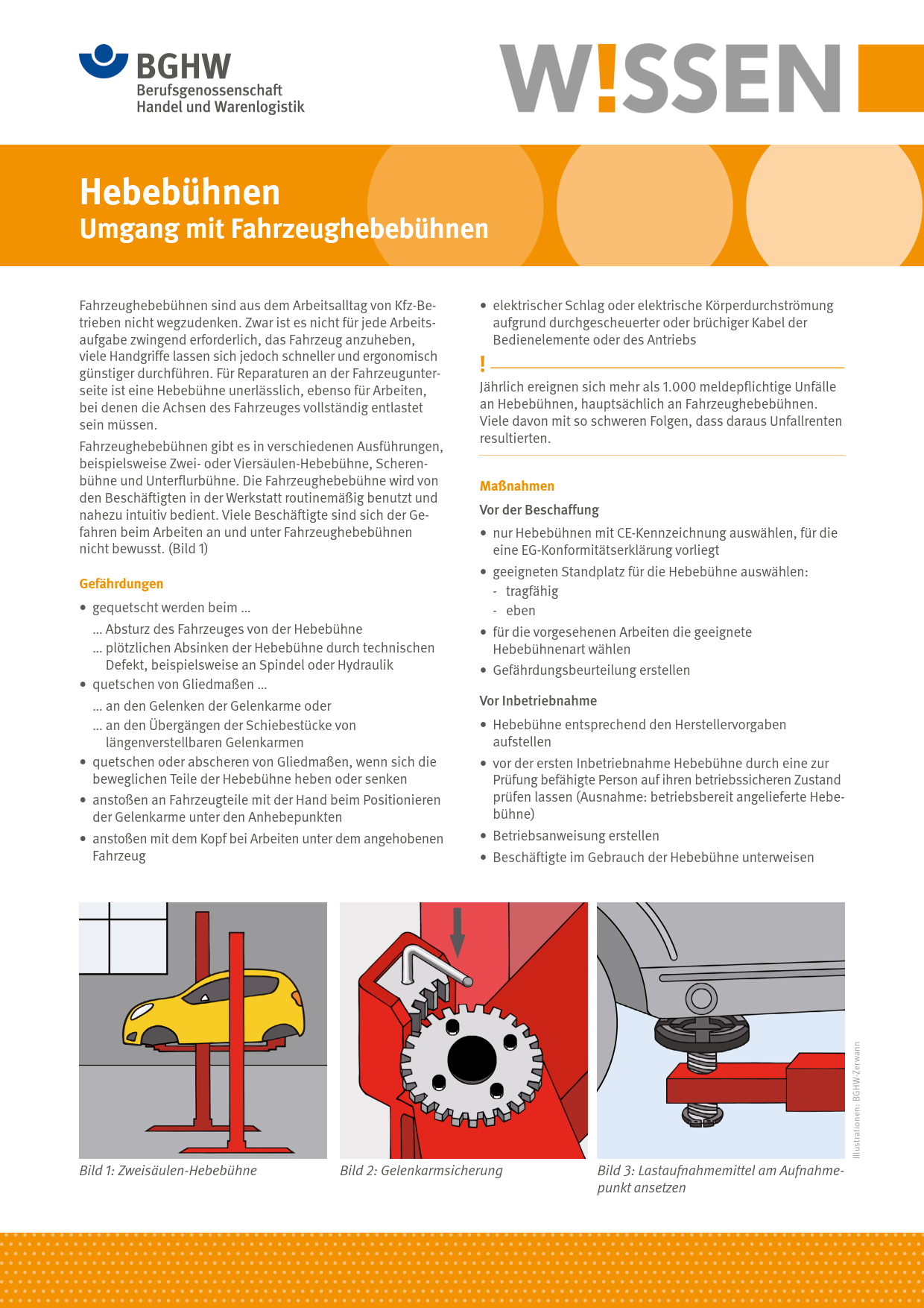 Dieses BGHW-Wissen befasst sich mit Gefährdungen und sinnvollen Maßnahmen zum sicheren Umgang mit Fahrzeughebebühnen. Es enthält zudem Hinweise auf weiterführende Informationen.