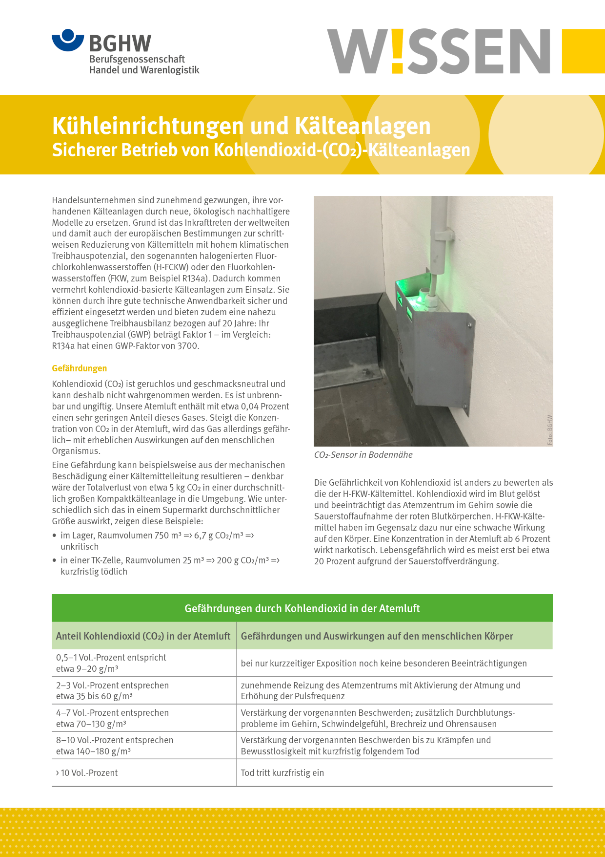 Dieses BGHW-Wissen beschreibt die Gefährdungen durch Kohlendioxid (CO2), das aus Kälteanlagen austreten kann. Es zeigt verschiedene Schutzmaßnahmen auf und enthält zudem Hinweise auf weiterführende Informationen.