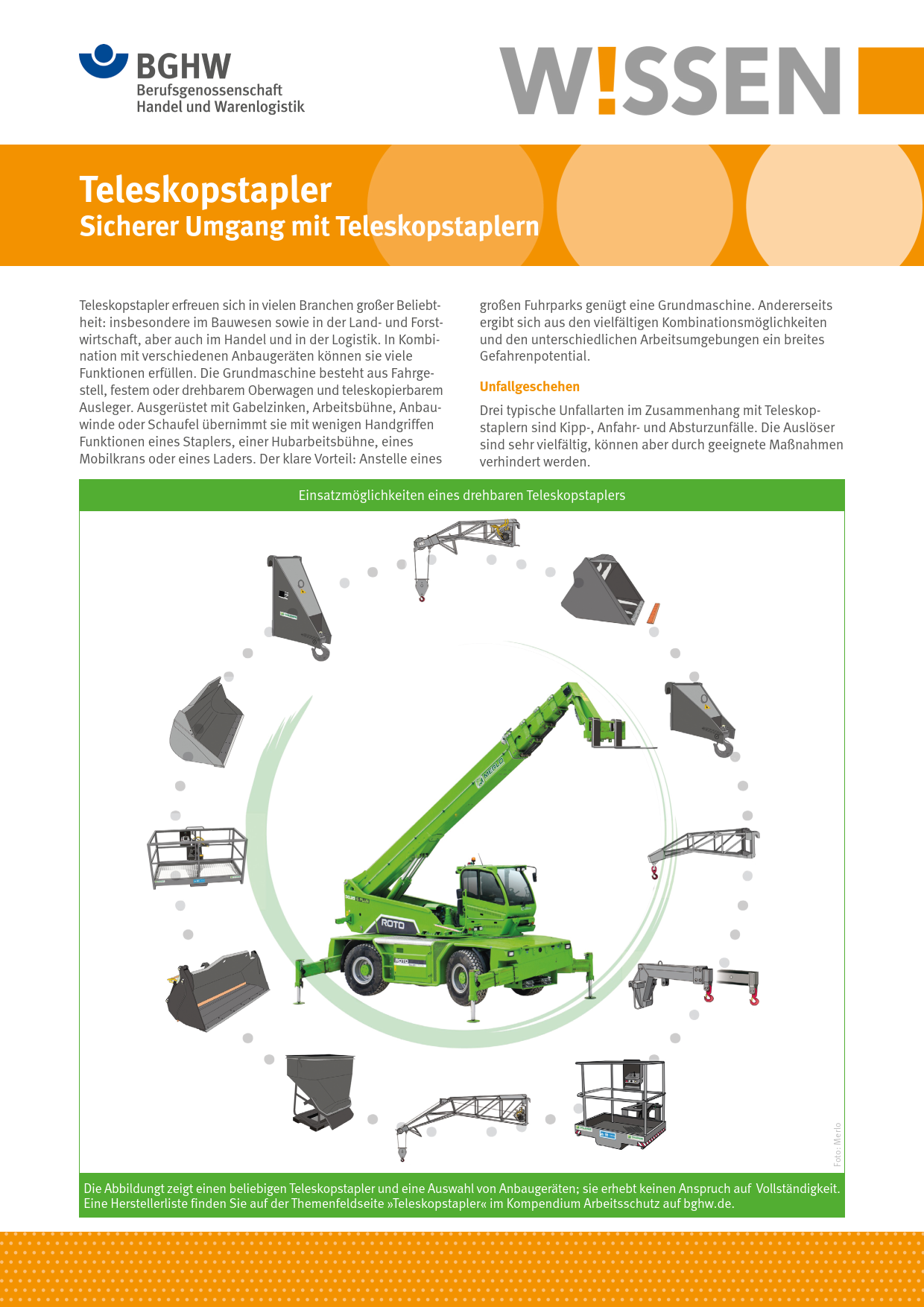 Dieses BGHW-Wissen beschäftigt sich mit dem Gefahren- und Unfallpotential, welches beim Einsatz von Teleskopstaplern mit verschiedenen Anbaugeräten in unterschiedlichen Arbeitsumgebungen entsteht. Thematisiert werden geeignete technische, organisatorische und personenbezogene Schutzmaßnahmen zur Gefahrenvermeidung oder Gefahrenreduzierung. Enthalten sind zudem Hinweise auf weiterführende Informationen.