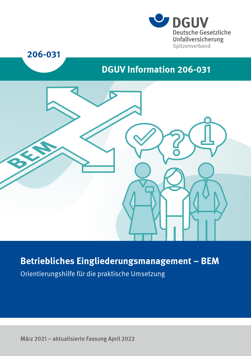 Diese DGUV Information zeigt Arbeitgeberinnen, Arbeitgebern und Beschäftigten die Chancen von Betrieblichem Eingliederungsmanagement (BEM) auf und unterstützt bei der praktischen Umsetzung. Die Erläuterung der Rechtsgrundlage sowie prägnante Hinweise und Tipps erleichtern insbesondere Kleinbetrieben die Umsetzung des BEMs.