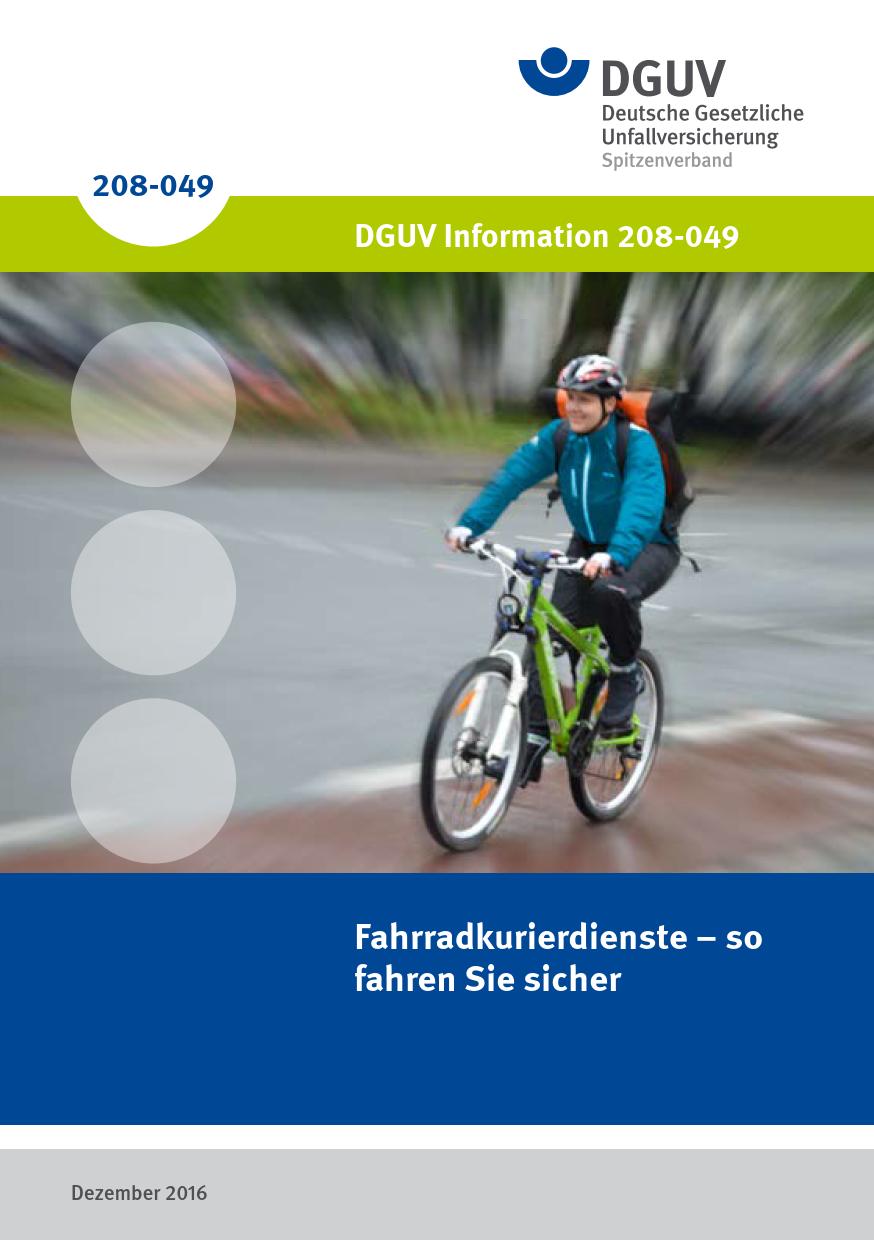 Diese DGUV Information soll dazu beitragen, die Gesundheit der im Fahrradkurierdienst Tätigen zu schützen und vor Schäden zu bewahren. Themen sind u. a.: Lärm, Ernährung, das sichere Fahrrad, Kommunikationsmittel, Transportbehälter, Erste Hilfe, Witterungseinflüsse und besondere Hinweise zur Verkehrsteilnahme.