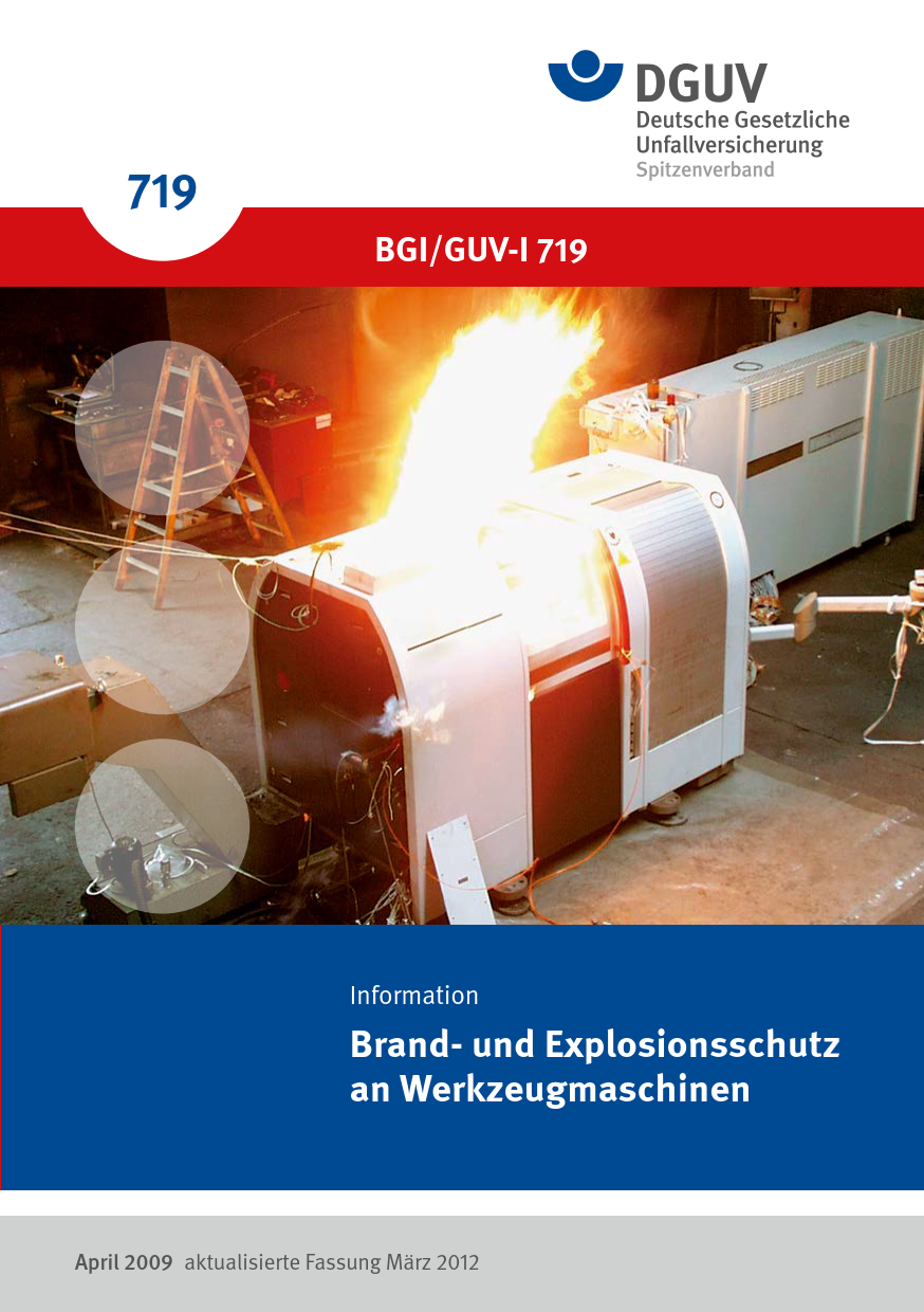 Dieses DGUV Information beschreibt Maßnahmen gegen Brand- und Explosionsgefährdungen beim Betrieb von Werkzeugmaschinen mit nichtwassermischbaren, brennbaren Kühlschmierstoffen. Themen sind u. a.: Rechtsgrundlagen, Beurteilung der Brand- und Explosionsgefährdung, Schutzmaßnahmen, Benutzung von Arbeitsmitteln, Unterweisung und Prüfungen.