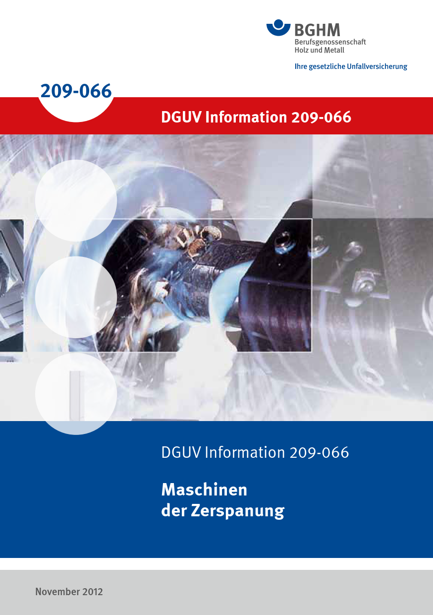 Diese DGUV Information behandelt u. a. folgende Themen: allgemeine Rechtsgrundlagen mit Hinweisen zur EG-Maschinenrichtlinie, Anforderungen an das sichere Betreiben von Maschinen der spanabhebenden Bearbeitung durch Drehen, Bohren, Fräsen und Sägen, automatisierte Fertigungssysteme, Manipulation von Schutzeinrichtungen an Maschinen, Brand- und Explosionsschutz an Werkzeugmaschinen, Gesundheitsschutz beim Einsatz von Kühlschmierstoffen, ergonomische Gestaltung von Arbeitsplätzen sowie das Prüfen von Werkzeugmaschinen nach der Betriebssicherheitsverordnung (BetrSichV).
