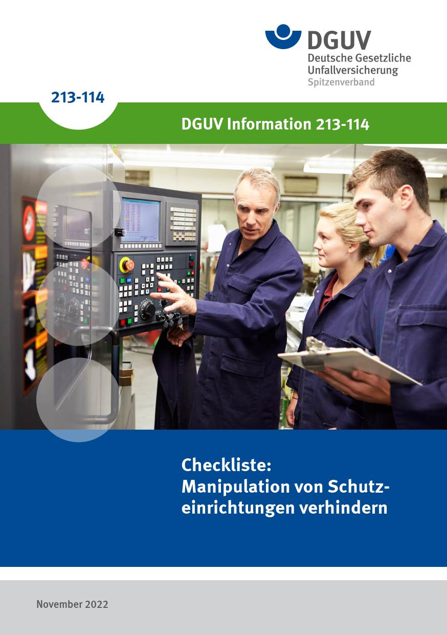 Diese DGUV Information bietet eine Checkliste, mit der Manipulationspotenziale in Bezug auf Schutzeinrichtungen von Maschinen erkannt werden können. Dabei werden folgende Bereiche abgedeckt: Beschaffung der Maschine, Eignung der Maschine, Eignung der Schutzeinrichtungen, Mitarbeiterführung und Schulung.