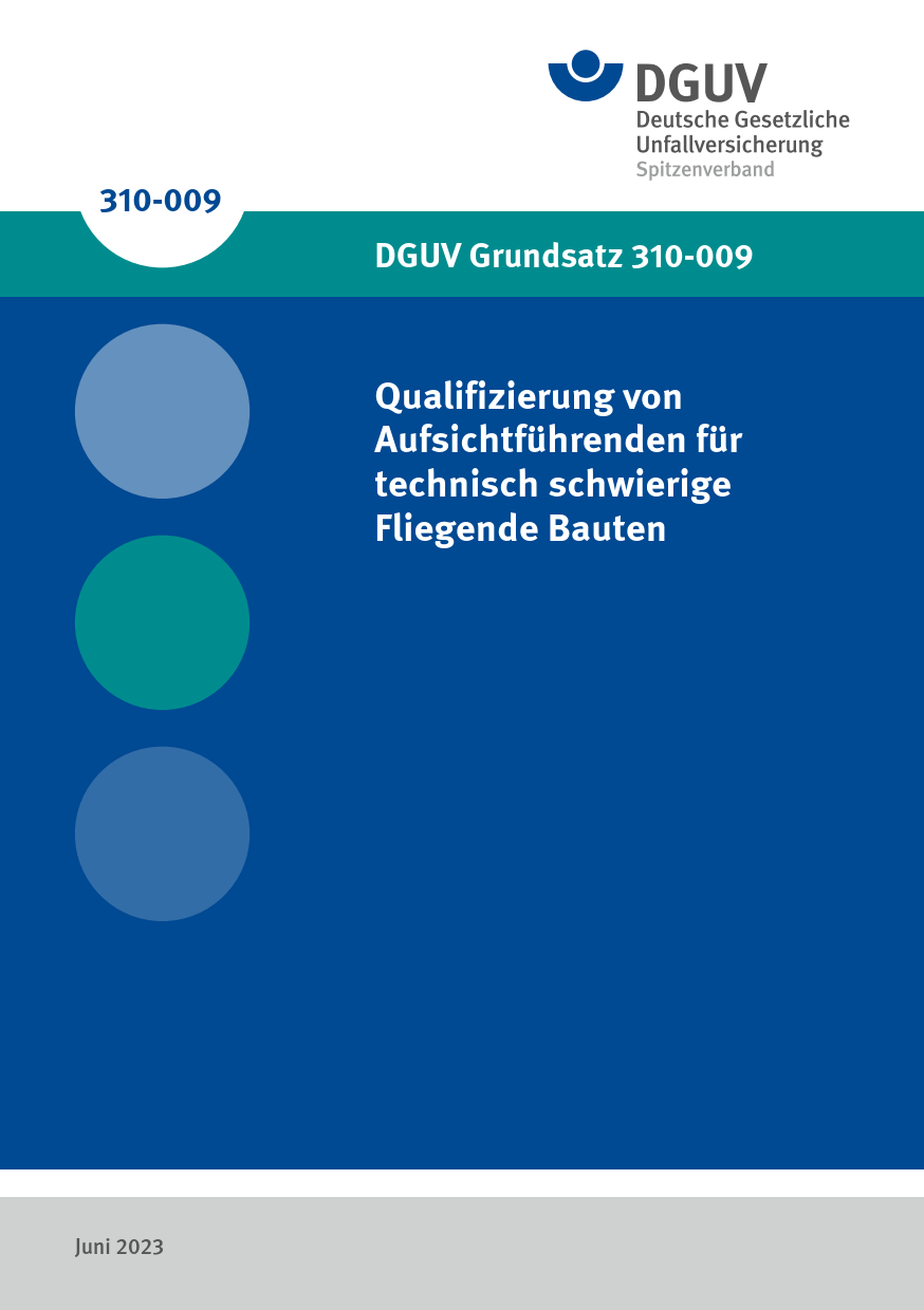 Dieser DGUV Grundsatz enthält die Ausbildungs- und Prüfungsanforderungen für den Erwerb des Ausbildungsnachweises für Aufsichtführende für den Aufbau, Abbau, die Verladearbeiten und den Betrieb von technisch schwierigen Fliegenden Bauten. Ziel ist es, dass die Aufsichtsführenden nach ihrer Ausbildung über die erforderlichen Kenntnisse für ihre verantwortungsvolle Aufgabe verfügen. Die Ausbildung muss nach diesem Grundsatz erfolgen, um die Forderungen der DGUV Vorschrift 19 „Schausteller- und Zirkusunternehmen“ zu erfüllen.